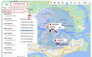 Search for vehicles around a PoI or location. Set a radius to locate nearby assets, useful in emergencies or unexpected stops.