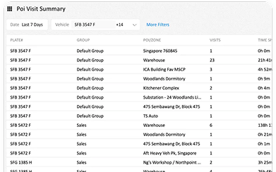 See which PoIs were visited, visit counts, and time spent at each location for efficient fleet management.