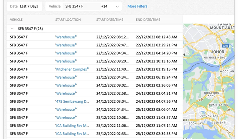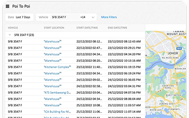 View start/end points, distances traveled, and fuel usage between PoIs. Track vehicle activity over time for better operational control.