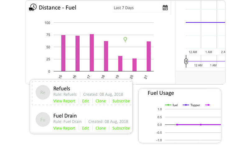 Generate reports and charts to analyze monthly fuel consumption, refuels, drains, and distance-to-fuel efficiency. Make data-driven decisions with clear graphical insights.
