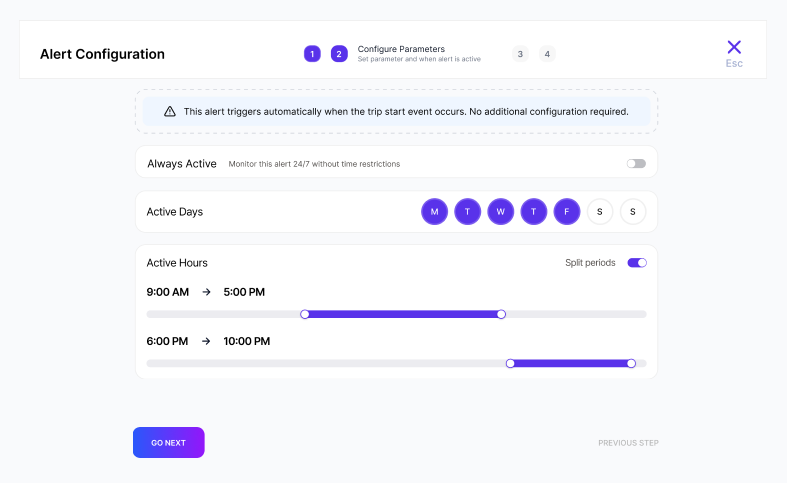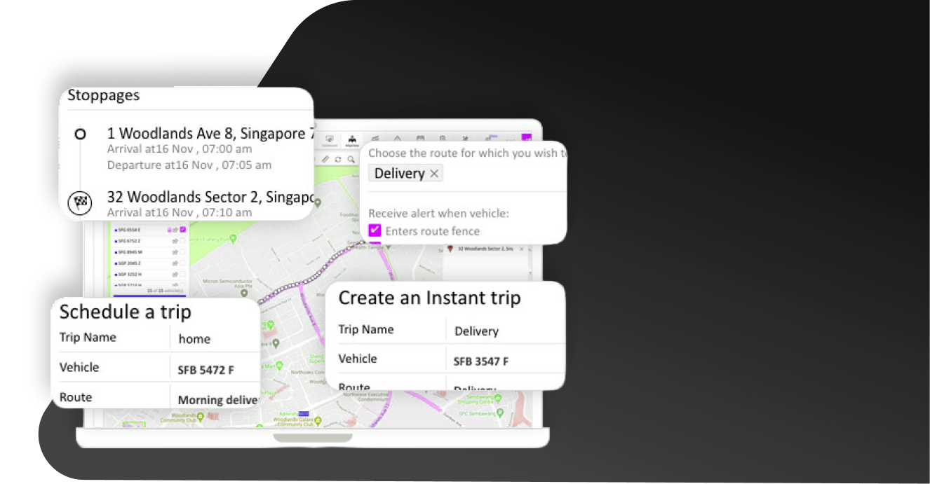 Create trip schedules with pre-planned routes. Add up to 24 waypoints per trip, set daily or weekly plans, and monitor progress with alerts for deviations.