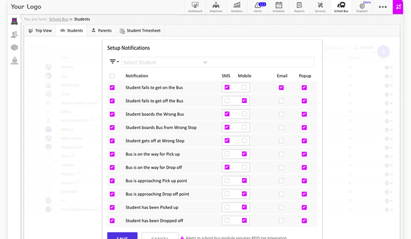 Monitor student attendance and bus locations using RFID tracking. Receive location-based alerts and ensure all students are accounted for safely.
